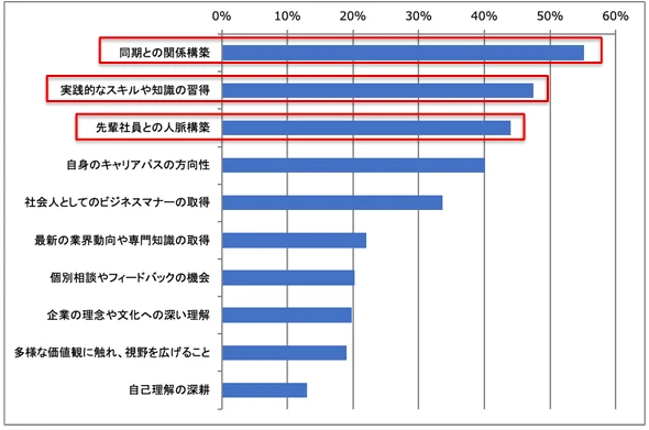 「同期との関係構築」が55%で最多。実践的スキル習得を上回る結果に。