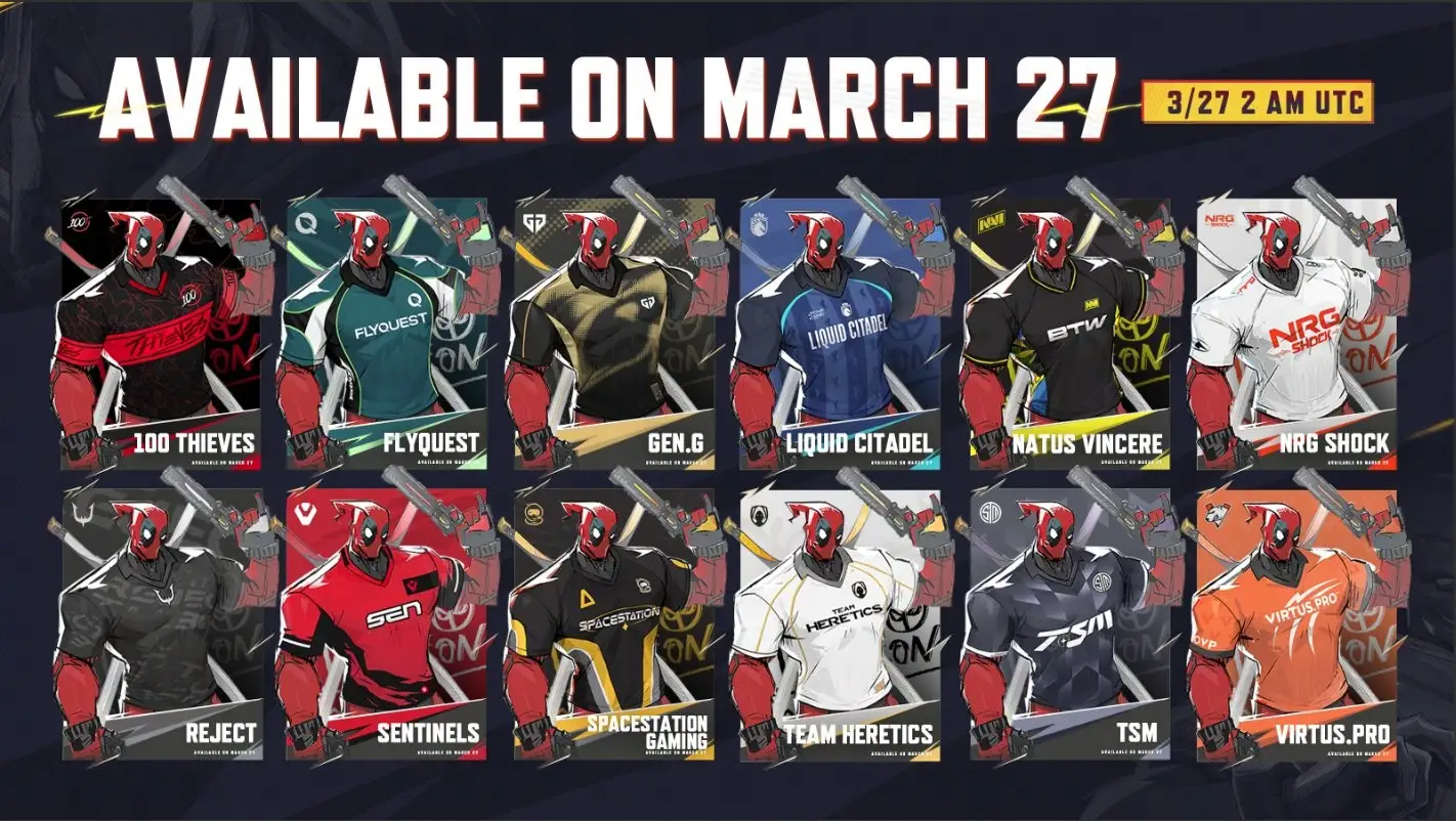 REJECT Team Bundleには、デッドプールのREJECT特別スキン(ユニフォーム着用、胸・背中にREJECTロゴ入り)をはじめ、REJECTマスコットキャラクター「じぇじぇ」のスプレー、Mood、絵文字などが含まれます。